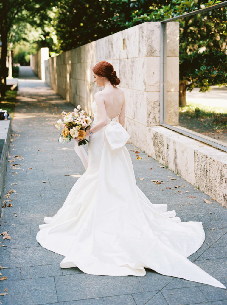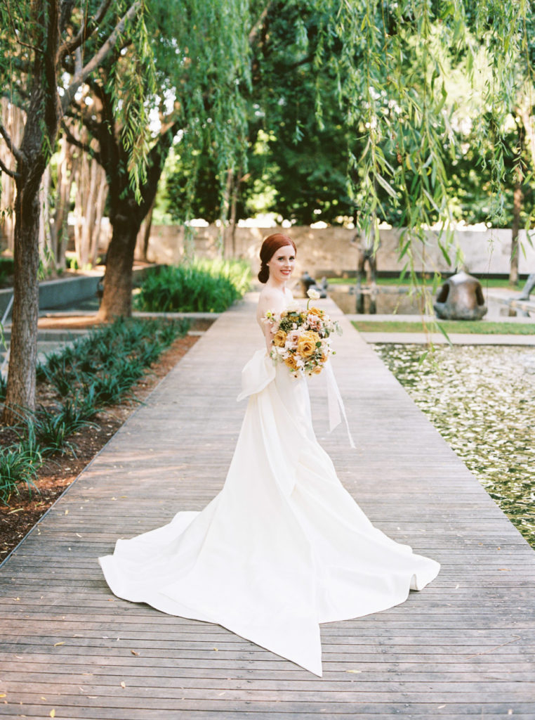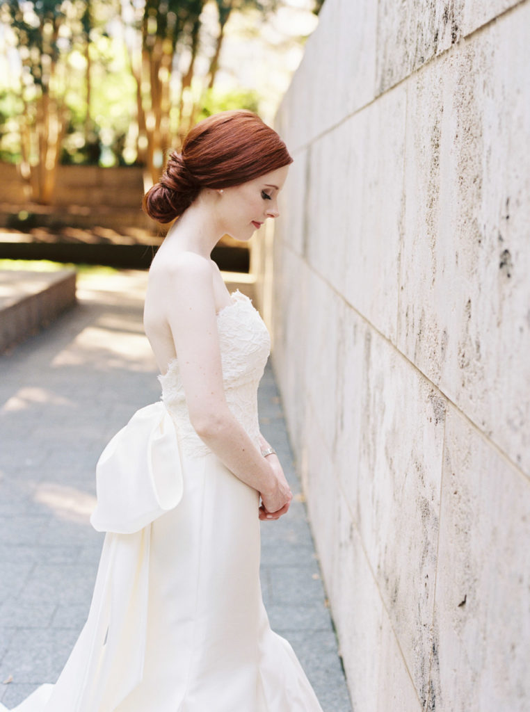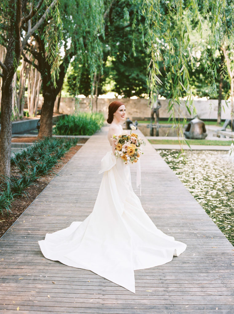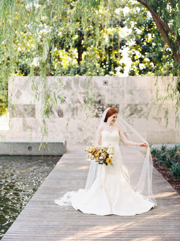 Many brides envision the Nasher Sculpture Center as the perfect wedding backdrop to say their I-do’s! Kristen chose their gardens as the venue for her Dallas bridal portraits, complemented by her gorgeous bouquet of floral by Max Owens Design. She wore silk ivory gown with the most amazing bow by Sareh Nouri. I was in love with how her red hair photographed on film! Being a Dallas luxury wedding photographer, I love to shoot at the Nasher as often I can and utilize their amazing weeping willow tree in the back of the gardens! These Nasher bridal portraits will forever hold a place in my heart. Kristen and Jimmy’s wedding, planned by After Yes, was also published in D Weddings magazine earlier this year.